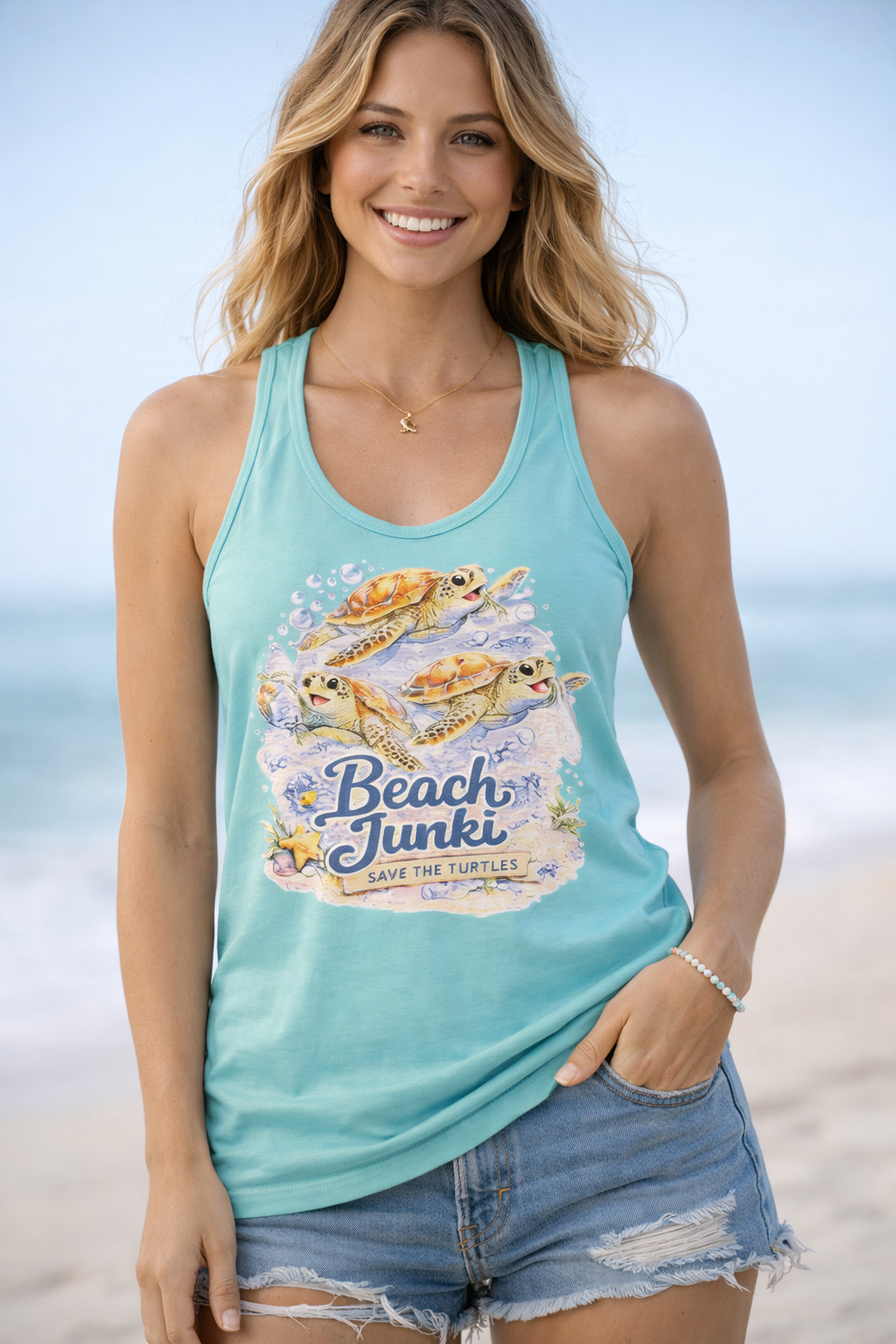 Our Beach Junki blue tank top features a vibrant sea turtle design paired with the message “Save the Turtles,” making it the perfect blend of beach style and conservation pride. With its soft, breathable fabric and relaxed, flattering fit, this tank is made for sunny days, salty air, and everything from beach walks to festivals and cleanups.